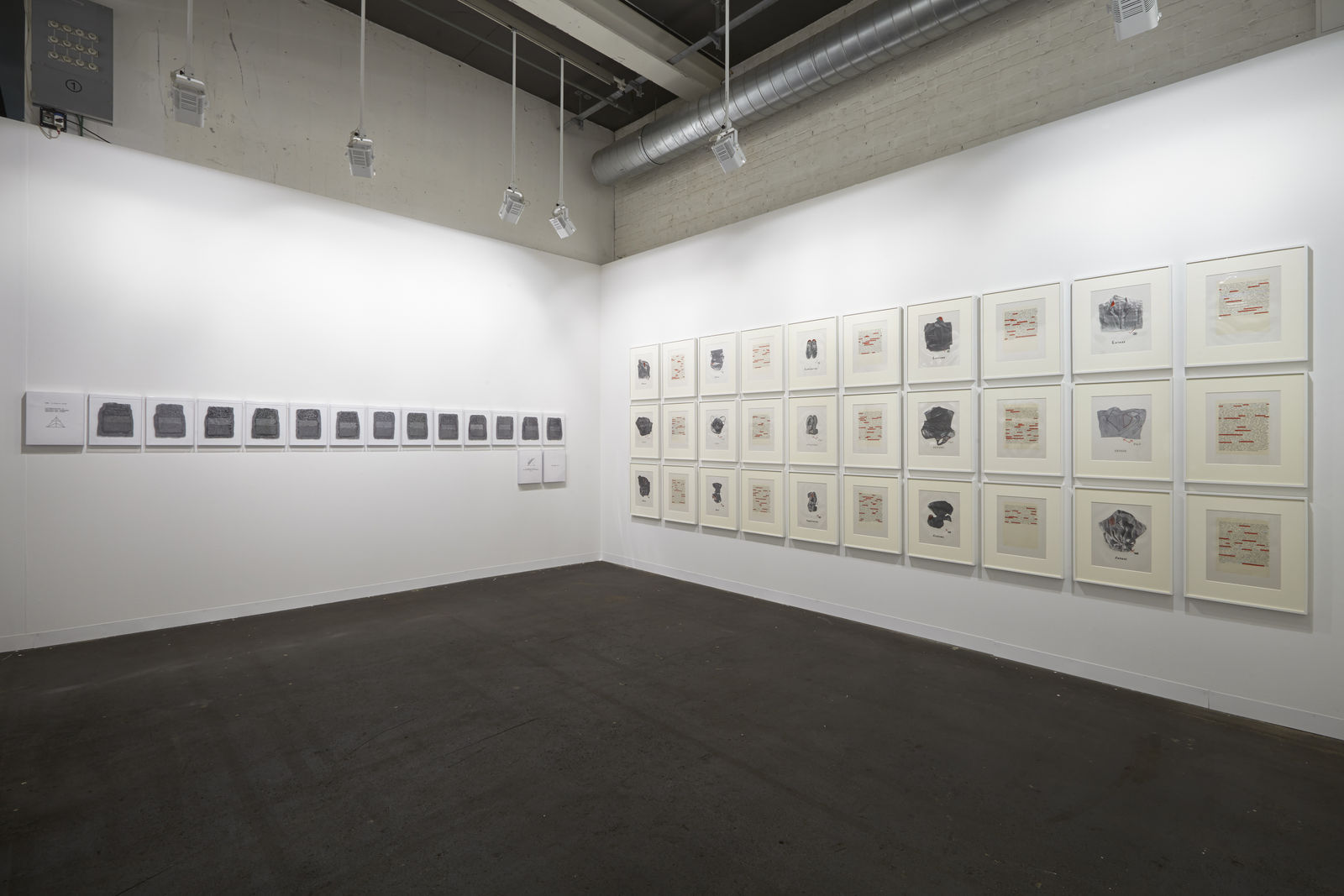 Dicere (2014), on view for the first time at Art Basel, combines, in compressed lint, the satellite transmission of a drone target with a narrative based on the account of two witnesses, Zubair, 13 and Nabila, 9, who testified at a Congressional Hearing on Drone Strikes in Washington on October 29, 2013. The strike, which killed their grandmother, took place in North Waziristan a year earlier. In Dicere, as well as other works based on testimonies, such as Vox Manet (2005-08) and Mimus (2012), Kelly has used the durational aspect of the lint medium as a performative act of remembering. Individual units are cast in the filter screen of a domestic dryer over several months and hundreds of washing cycles, then assembled as large panels of intaglio text. In this way, Kelly gives voice, directly, in the process, and in the first person plural of the narrative, to a demand as well as an incommensurable loss.