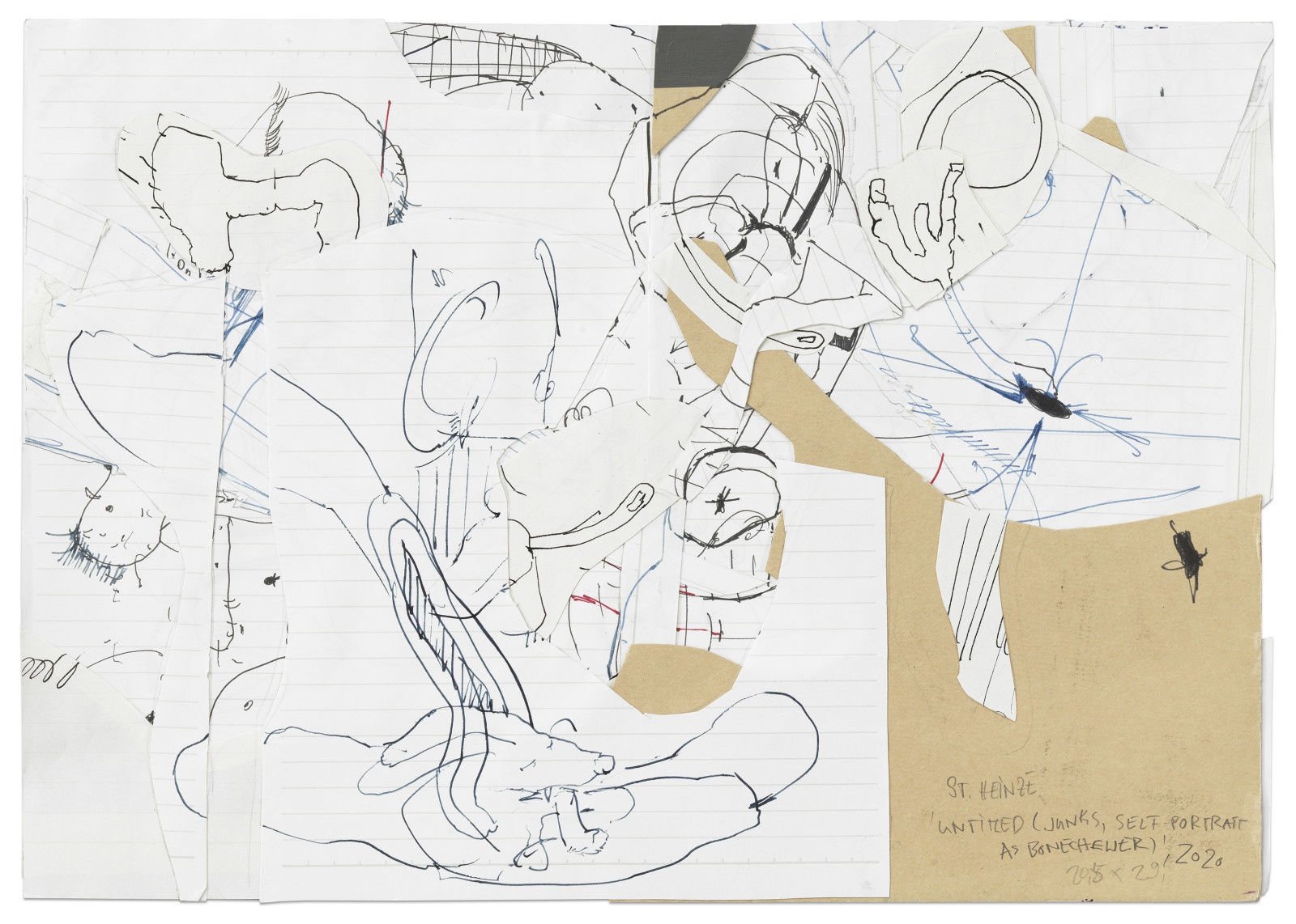 Heinze's work, Untitled (Junks, Self-portrait as Bonechewer), Untitled (Conjunction of II), 2020, acquired by Hammer Museum, LA, is a strong example of one of her double sided drawings. Drawing is a crucial part of her practice, and integral to the development of her paintings. In these works, Heinze allows traces of the reverse to be visible through the translucency of the paper. She further fragments the image with her use of collage.